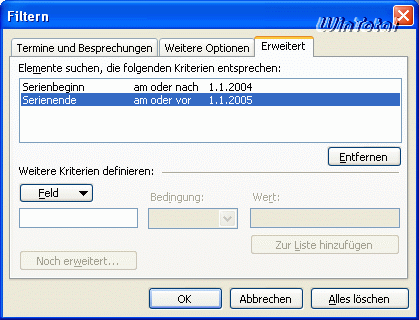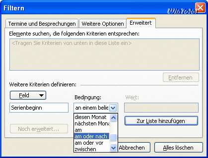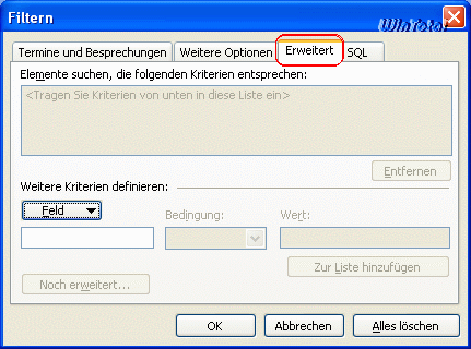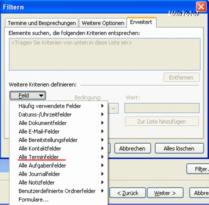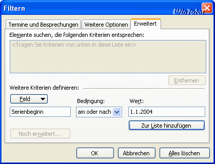 Über die Registerkarte Erweitert werden per Schaltfläche „Feld“ Alle Terminfelder die Kriterien definiert.