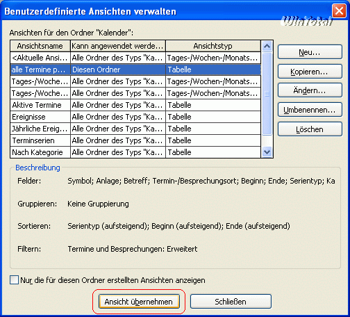 Um dieselben Anfangs- und Enddaten für Serienbeginn und Serienende einzustellen, werden wie oben beim Exportvorgangs unter Erweitert die Kriterien definiert. Sind alle Filter gesetzt, wird das Dialogfeld mit „OK“ bestätigt. Die Ansichtenliste „Benutzerdefinierte Ansichten verwalten“ öffnet sich wieder.