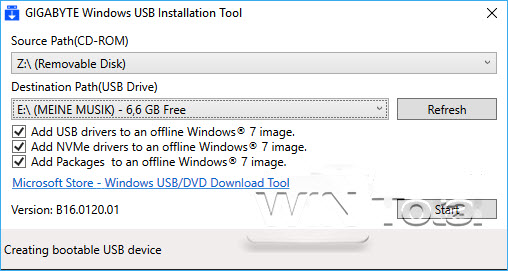 Auch GIGABYTE bietet mit dem Windows USB Installation Tool eine passende Softwarelösung an.