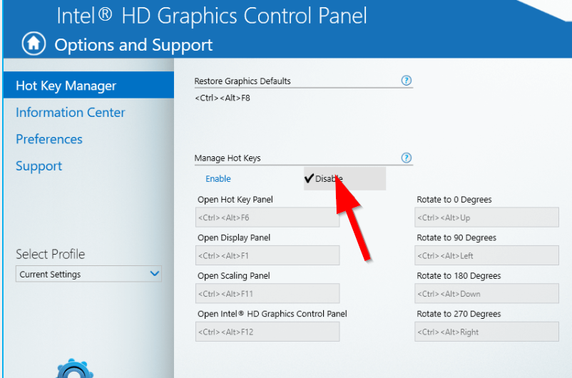 Da viele Anwender den Bildschirm an ihren Geräten versehentlich drehen, kann beispielsweise für Intel HD Graphics die Rotation per Tastenkombination über den Hot Key Manager im Intel Graphics Control Panel gesperrt werden. Dell hat diesen Hotkey, mit dem man die automatische Sperrung ausschalten kann, für Intel HD Graphics in neueren Geräten entfernt.