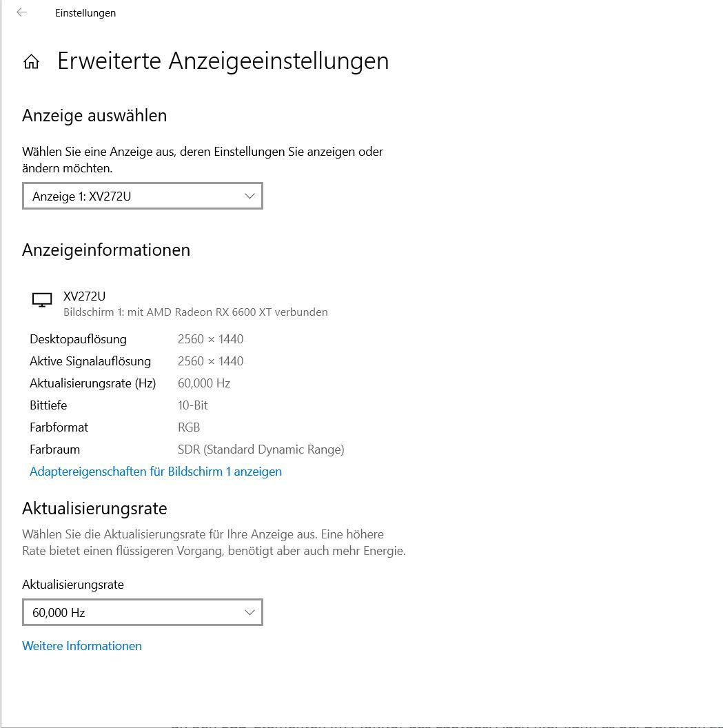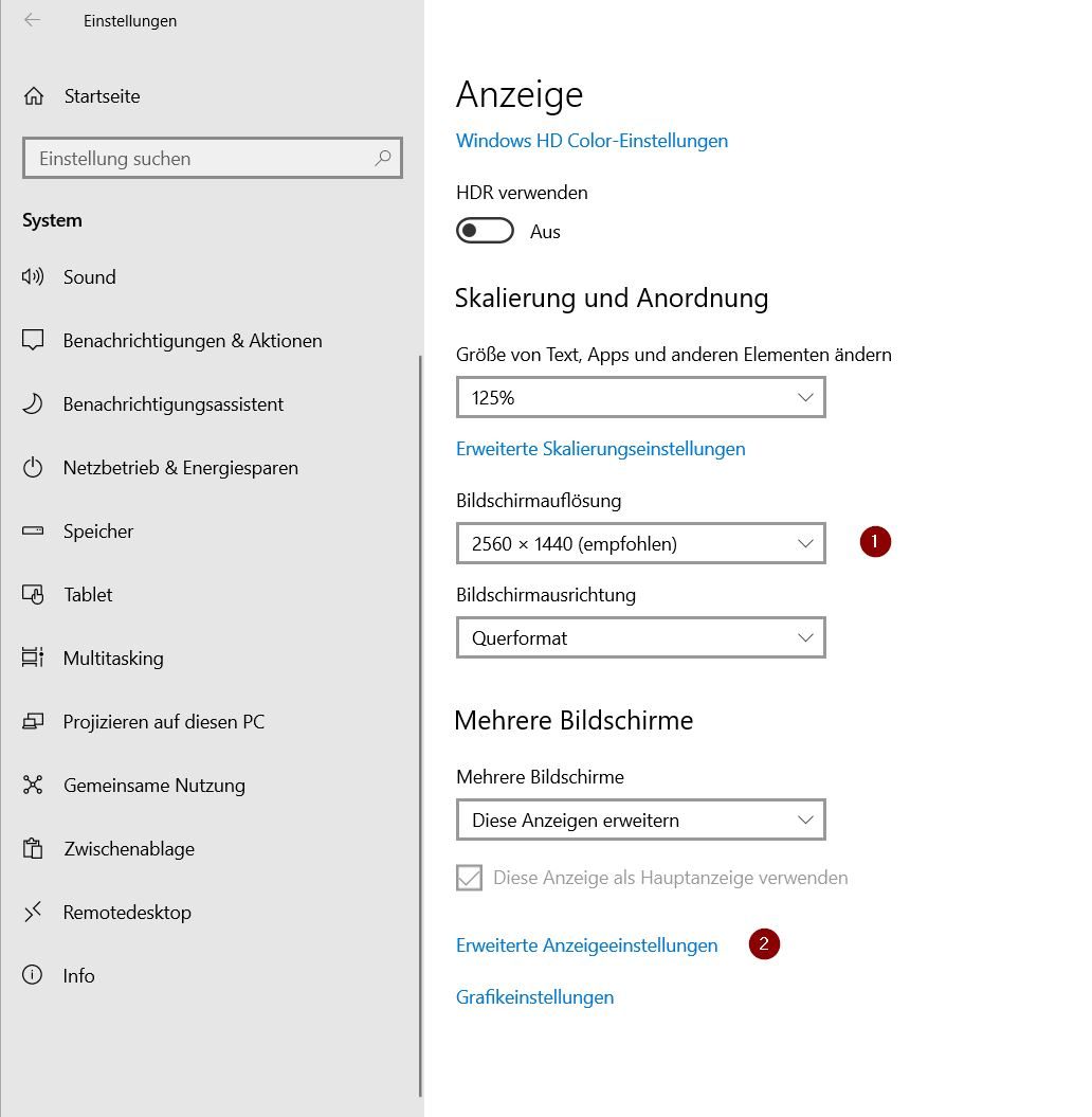 In den erweiterten Anzeigeeinstellungen (2) können Sie zudem die Aktualisierungsrate auch manuell anpassen, sollte Windows eine zu hohe Zahl auswählen.