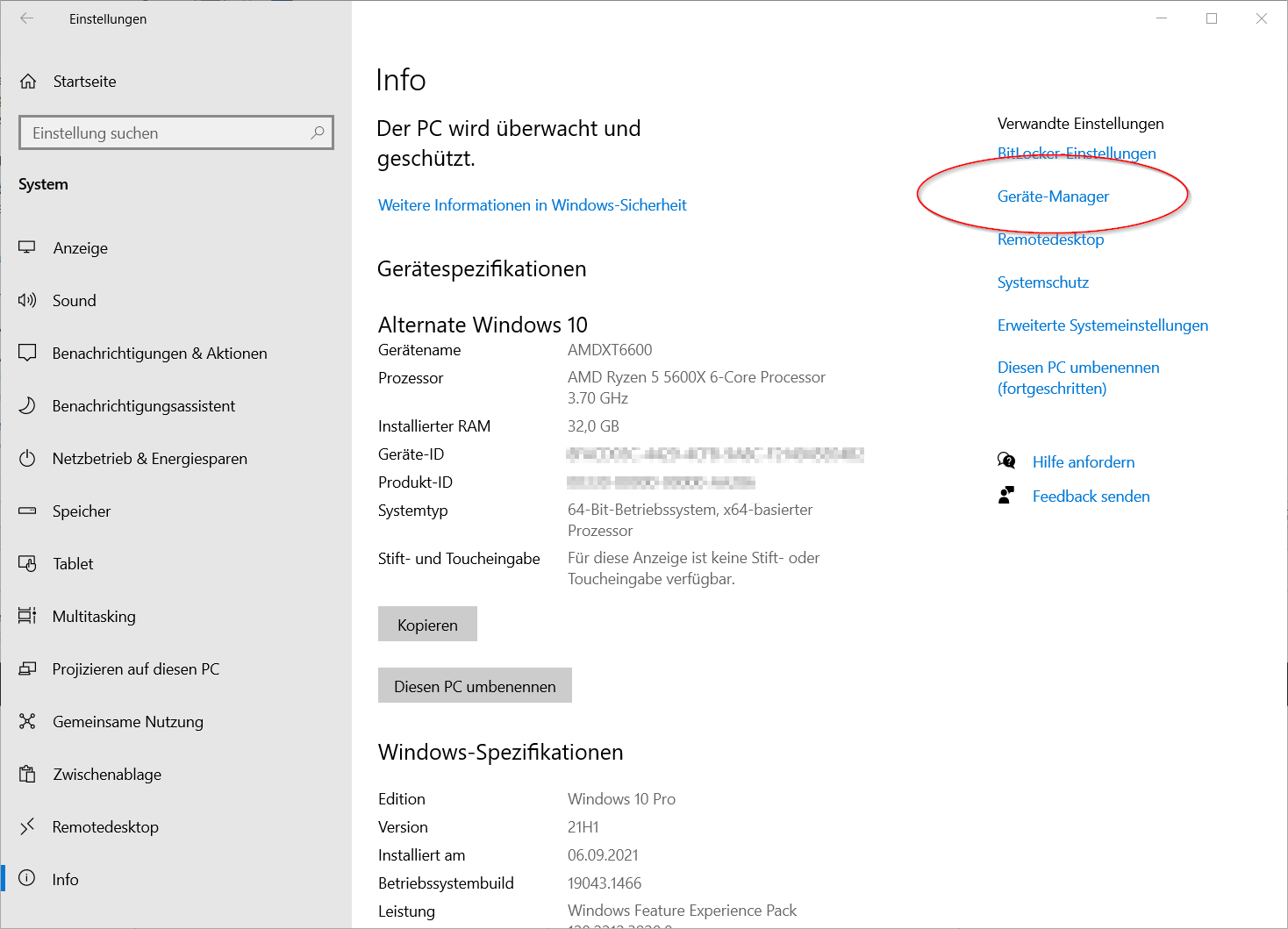 Starten Sie dazu den Geräte-Manager in der Systemsteuerung von Windows oder über die Einstellungen in „System“, wählen Sie dort „Info“ und klicken dann rechts auf den Link „Geräte-Manager“.