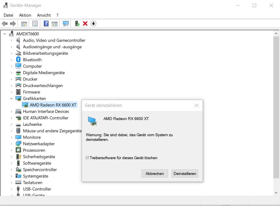 Im Abschnitt Grafikkarte finden Sie die installierte Grafikkarte. Wählen Sie über das Kontextmenü die Funktion „Gerät deinstallieren“ und bestätigen Sie die Funktion „Die Treibersoftware für dieses Gerät löschen“.