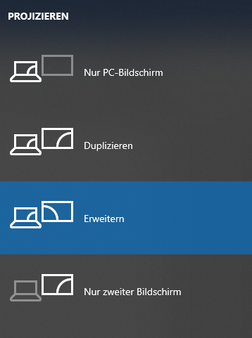 Wenn Sie einen externen Bildschirm mit Ihrem Laptop verbinden, können Sie mit der Windows-TastenkombinationWin+P das Bild vom Laptop duplizieren, erweitern oder nur auf dem externen Display wiedergeben.