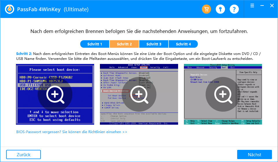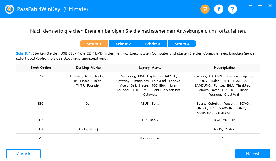 Im nächsten Schritt zeigt Ihnen der Assistent an, wie die Bootreihenfolge bei verschiedenen Laptops und PCs so ändern können, dass der Computer von dem Notfallsystem bootet.