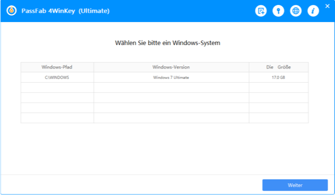 Im dritten Schritt booten Sie von dem PassFab 4Winkey-Notfalldatenträger. Die Software zeigt Ihnen die gefundenen Windows-Installationen aus. Wählen Sie hier das Windows aus, für welches Sie das Kennwort vergessen haben.