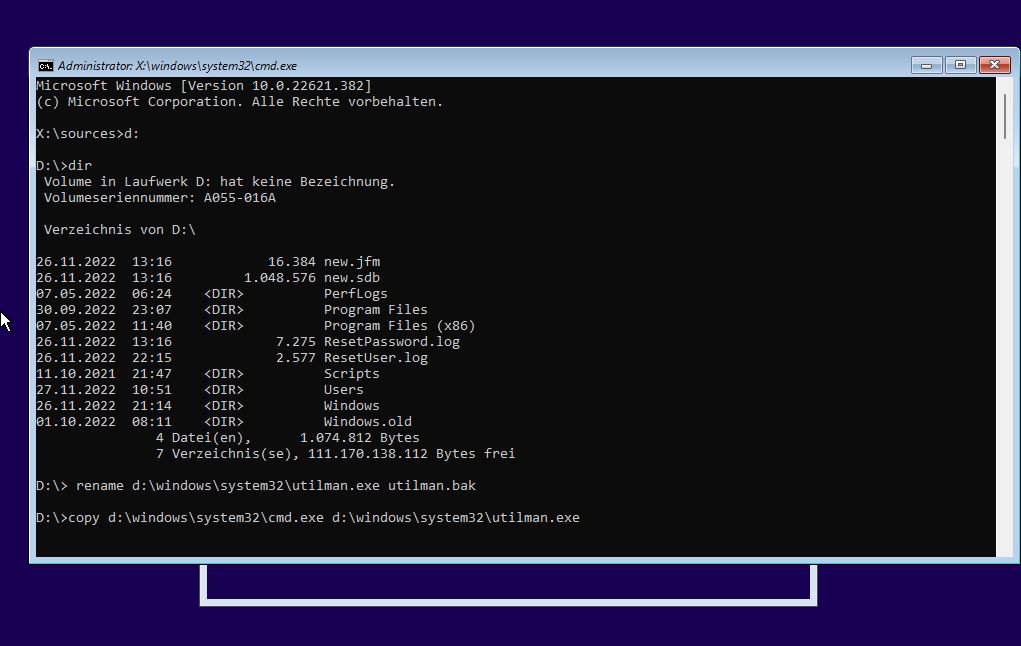 rename D:\Windows\system32\utilman.exe utilman.bak copy D:\Windows\system32\cmd.exe D:\Windows\system32\utilman.exe
