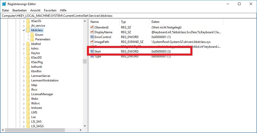 - Navigieren Sie zum Schlüssel „HKEY_LOCAL_MACHINE\System\CurrentControlSet\Services\kbdclass“ und ändern Sie den Wert bei „Start“ auf „4“. Speichern Sie Ihre Einstellungen mit „OK“ und schließen Sie die Registry.