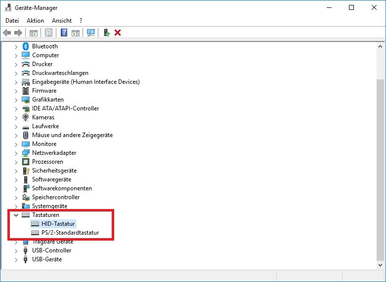- Der Windows Gerätemanager öffnet sich. Wählen Sie unter „Tastaturen“ den Eintrag „HID-Tastatur“ aus (abhängig von Ihrem Gerät und der Betriebssystemversion kann die Bezeichnung auch etwas abweichen).