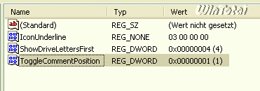 Um zuerst den Rechnernamen statt der Computerbeschreibung (Kommentar) als Quelle anzugeben, fügt man noch einen zweiten DWORD-Wert (32-Bit) im gleichen Registry-Pfad hinzu mit dem Namen ToggleCommentPosition und dem Wert 1.