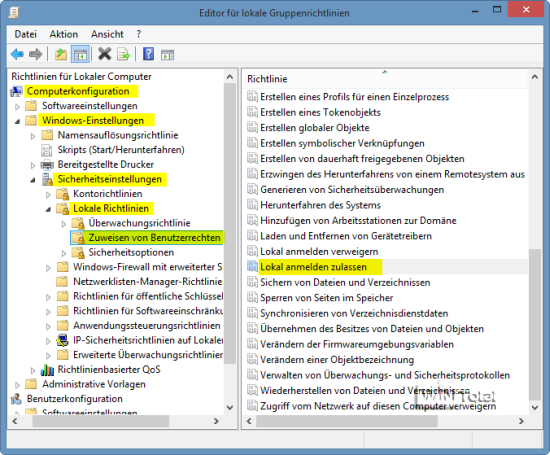 Voraussetzung ist allerdings, dass die Gruppenrichtlinien überhaupt ein lokales Anmelden erlauben: Computerkonfiguration > Windows-Einstellungen > Sicherheitseinstellungen > Lokale Richtlinien > Zuweisen von Benutzerrechten > „Lokal anmelden zulassen„.