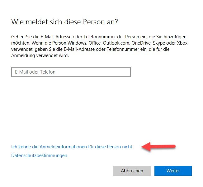 Will man unter Windows 10 über die Einstellungen -> Konten -> Familie und andere Benutzer eine weitere Person mit einem Konto hinzufügen, verlangt Windows 10 die Mailanschrift oder Telefonnummer der Person, welche ein Konto erhalten soll.