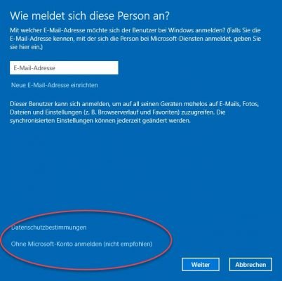 Klicken Sie hier auf „Ich kenne die Anmeldeinformationen für diese Person nicht“. Sie kommen dann zu einem Eingabefenster für Kontaktdaten zu dem neuen Konto. Ganz unten finden Sie „Benutzer ohne Microsoft-Konto hinzufügen„, womit ein lokaler Benutzer erstellt wird.