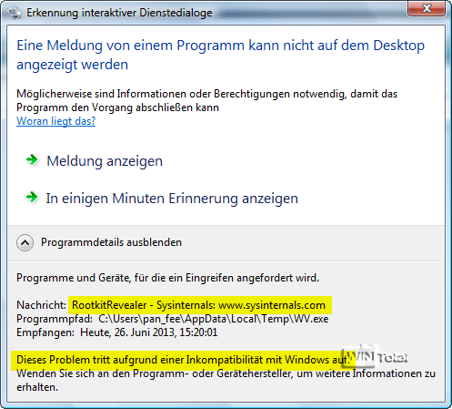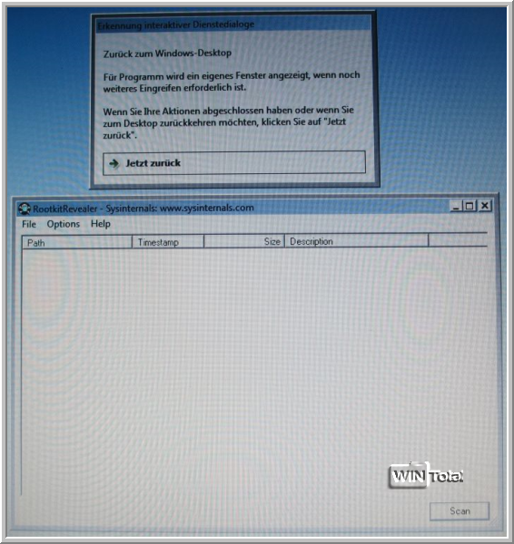 Das Programm RootkitRevealer ist ab Vista inkompatibel. Wird RootkitRevealer.exe ausgeführt, erscheint sofort „Erkennung interaktiver Dienstedialoge„: Eine Meldung von einem Programm kann nicht auf dem Desktop angezeigt werden.