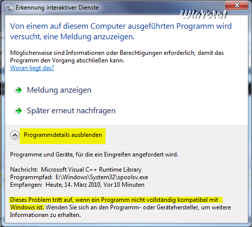 Das Programm selbst ist kompatibel zu Windows Vista, Windows 7 und Win 2008 R2, nur das nachinstallierte Programm, z.B. „Microsoft Visual C++“, ist inkompatibel. Es kann sich natürlich um andere inkompatible Runtimes handeln. Es kann natürlich sein, dass das Programm einen Dienst installiert hat. Unter Windows Vista, Windows 7 und Win 2008 (R2) ist die Interaktion zwischen einer Programmoberfläche und dem zugehörigen Dienst nicht mehr möglich.