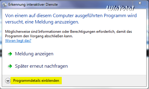 Der Dienst (Start/Ausführen: services.msc) UI0Detect (Erkennung interaktiver Dienste) benachrichtigt den Anwender, wenn die Möglichkeit besteht, in den Ablauf eines interaktiven Dienstes einzugreifen. Dieser Service wurde notwendig, weil ab Windows Vista aus Sicherheitsgründen alle Dienste in die Systemsession 0 verbannte, die keine Verbindung zur Oberfläche besitzt. Dienste bleiben daher unsichtbar und stumm, selbst wenn sie im Prinzip interaktiv programmiert sind. Wird der Dienst Erkennung interaktiver Dienste gestoppt, wird der Benutzer nicht mehr informiert.