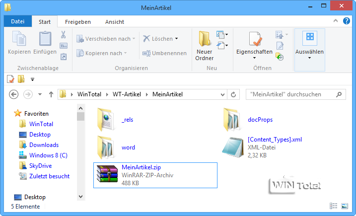 Alle aktuellen Office-XML-Formate (.docx, .xlsx, .pptx etc.) sind nichts anderes als Archive wie zum Beispiel auch Zip, Rar, 7z, Ace, 7-zip… Handelt es sich z.B. um ein Word-Dokument (.docx), ändern Sie die Dateiendung in .zip (Beispiel: „MeinArtikel.docx“ -> „MeinArtikel.zip„). Achten Sie beim Umbenennen des Dateityps auf ein paar Kleinigkeiten – Tipp hierzu.