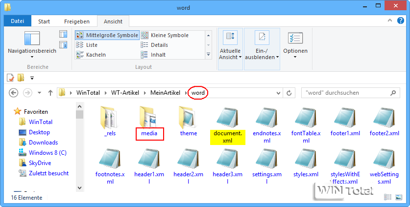 Im Ordner „word“ mit Ordner „media“ und Datei „document.xml“