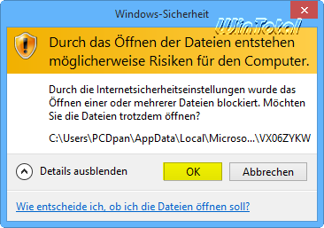Löschen Sie den Inhalt des Ordner. Falls die Meldung „Durch das Öffnen der Dateien entstehen möglicherweise Risiken für den Computer“ erscheint, bestätigen Sie mit [OK]. Wenn Sie Outlook jetzt neu starten, sollten die Bilder in HTML-Mails korrekt angezeigt werden.