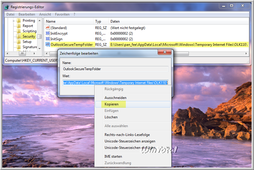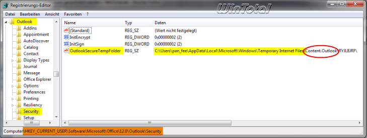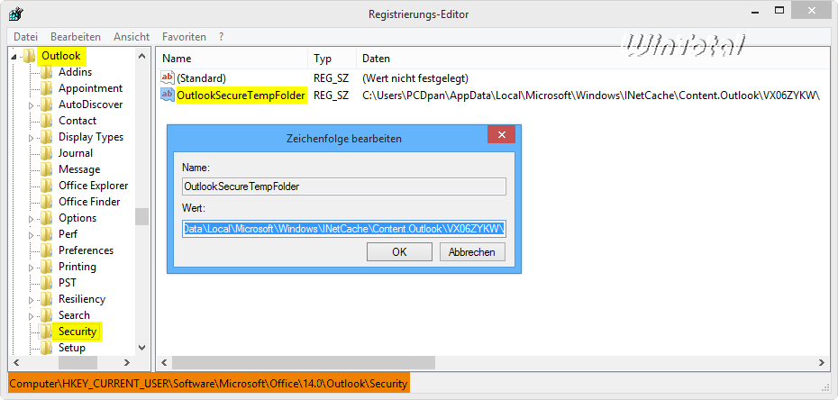 Microsoft Outlook 2010 – OutlookSecureTempFolder Wertpfad kopieren