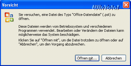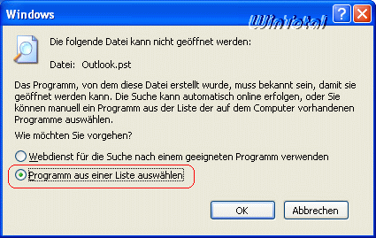 Nun zuerst Outlook und dann die kopierte Outlook.pst zusätzlich mit einem Doppelklick öffnen. Evtl. wird gefragt, mit welchen Programm geöffnet werden soll.