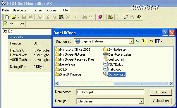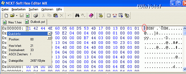 Jetzt wird der Hex-Editor gestartet und unter „Datei – Öffnen“ die kopierte Outlook.pst geöffnet.