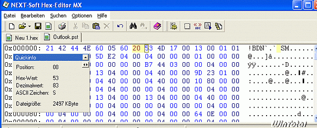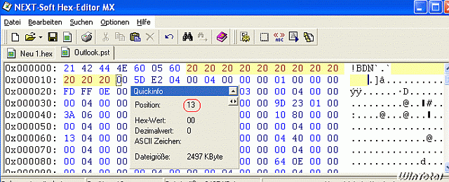 Ein hexadezimaler Datei-Editor ist ein Programm, mit dem man jede beliebige Datei auf binärer Ebene verändern kann. In diesen Fall beschädigen wir die PST-Datei damit.