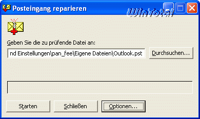 Jetzt wird das Tool Scanpst gestartet und der Pfad zur kopierten, bearbeiteten Outlook.pst angegeben.
