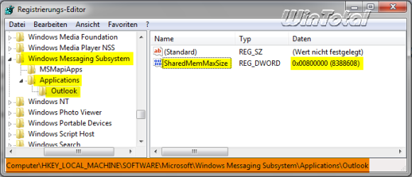 Fügen Sie im rechten Fenster von Outlook einen neuen DWORD-Wert (32-Bit) mit dem Namen SharedMemMaxSize hinzu und ändern Sie den hexadezimalen Wert auf 800000