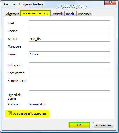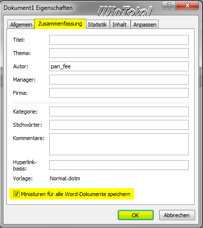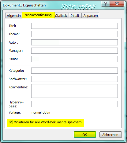 Wechseln Sie auf die Registerkarte „Zusammenfassung“ und aktivieren Sie die Option Miniaturen für alle Word-Dokumente speichern.