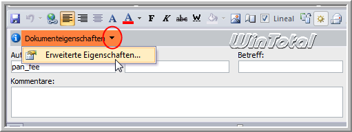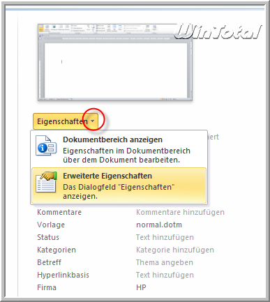 Öffnen Sie Word, klicken Sie die Ribbon-Schaltfläche an und gehen Sie auf „Vorbereiten“ -> „Eigenschaften“ -> oben links auf den kleinen Pfeil von „Dokumenteigenschaften“ und dann auf „Erweitere Eigenschaften“.