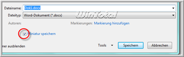 Wenn Sie viel mit Word-Dokumenten arbeiten, dann können Sie die Miniaturansicht aktivieren, um das Dokument leichter wieder zu finden. Es wird ein kleines Abbild der ersten Dokumentenseite angelegt, welches später im Windows Explorer angezeigt wird und dort zur leichteren Identifizierung des Dokuments dient.