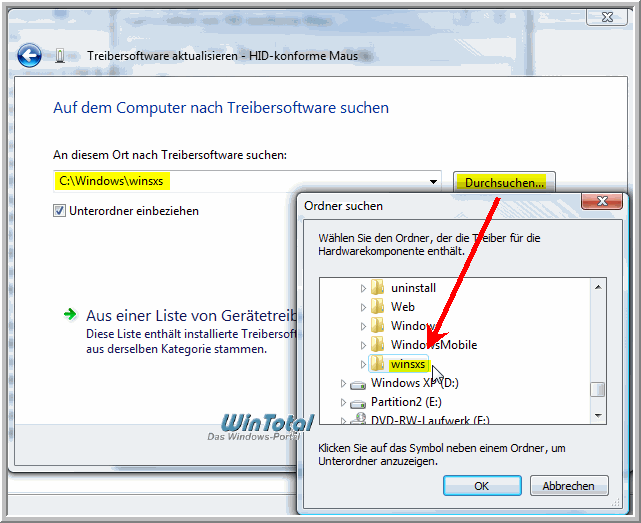 Im Gerätemanager „Mäuse und andere Zeigegeräte“ bzw. für die USB-Tastatur „Tastaturen“ aufrufen – unter „Eigenschaften“ der USB-Maus/USB-Tastatur die Registerkarte „Treiber“ anklicken und den passenden Treiber suchen lassen („Treiber aktualisieren…“). Hier muss der Pfad „C:\windows\winsxs“ angegeben werden. Falls eine Warnmeldung erscheint, dass ein „unsignierter Treiber“ verwendet wird, die Installation dennoch fortsetzen.