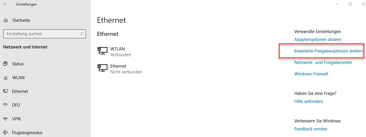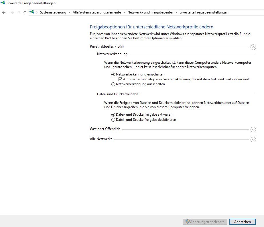 Dieser Textlink bringt Sie in die klassischen Freigabeoptionen von Windows 7 oder Windows 8.1. Aktivieren Sie hier die Datei- und Druckerfreigabe.