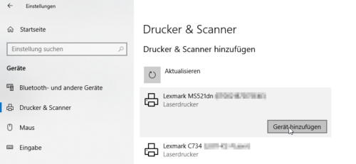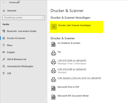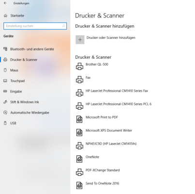 Wenn alles funktioniert, sollte der Netzwerkdrucker unter „Drucker und Scanner“ in den Einstellungen bei „Geräte“ von Windows 10 zu finden sein.