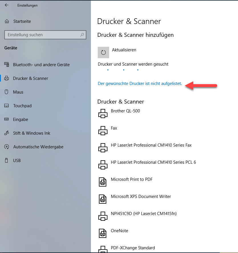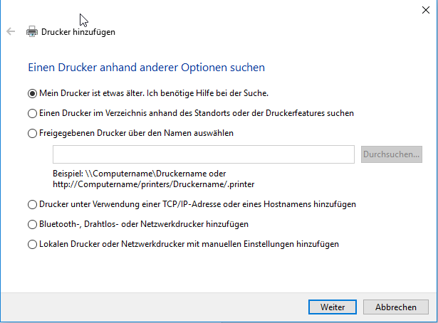 Sie haben nun mehrere Möglichkeiten, den nicht automatisch gefundenen Netzwerkdrucker in Windows 10 einzubinden.