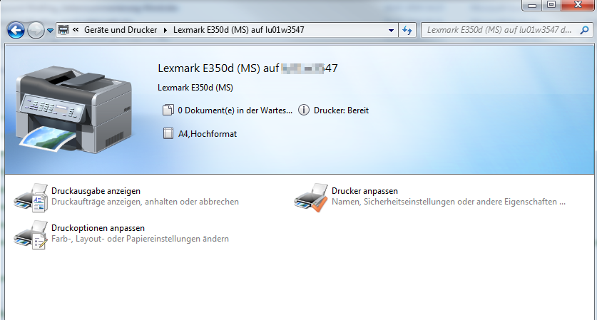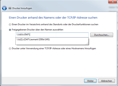 Wenn der Drucker lokal an einem PC angeschlossen ist und manuell freigegeben wurde, suchen Sie den Drucker über den Freigabenamen des Druckers (siehe 3.). Dazu geben Sie den Computernamen des PCs gefolgt von dem Freigabenamen des Druckers an, z. B. \\lan1547\Lexmark E350d (MS).