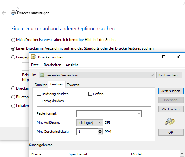 Windows kennt noch weitere Arten, wie Drucker verbunden werden können. In größeren Netzwerken werden Drucker auch über Standorte in Active Directory verwaltet und können über eine Suche nach dem Standort (Büro, Etage) oder Druckerfeatures (Format, Farbfunktion) etc. gefiltert und gesucht werden.