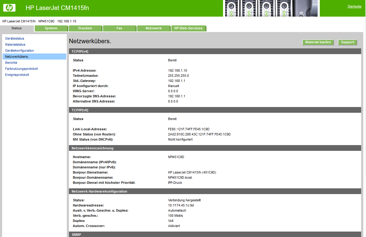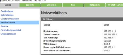 Sobald der Drucker in das Netzwerk eingebunden ist, erhält er per DHCP vom Router eine eigene IP-Adresse.