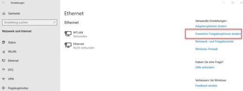 Damit eine Druckerfreigabe auch funktioniert, muss die Datei- und Druckfreigabe in Windows aktiviert werden. Sie finden die Verwaltung der Freigabeoptionen über den Textlink „Erweiterte Freigabeoptionen ändern“ in den Einstellungen unter Netzwerk und Internet.