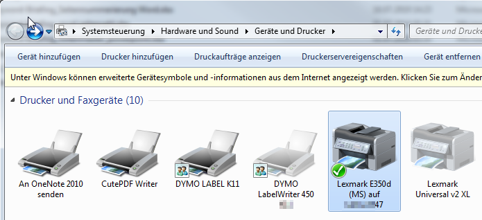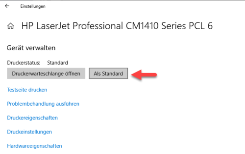 In der Verwaltung des Druckers finden Sie dann die Funktion „Als Standard“. Wenn Sie diese Schaltfläche anklicken, wird der ausgewählte Drucker künftig als Standarddrucker verwendet.