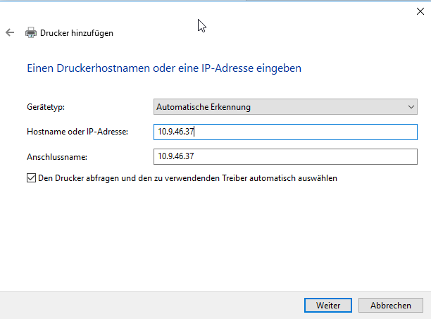 Wenn der Drucker als echter Netzwerkdrucker über eine eigene IP-Adresse verfügt, können Sie den Drucker auch über die IP-Adresse hinzufügen. Wählen Sie dazu die Option „Drucker unter Verwendung einer TCP/IP-Adresse oder Hostnamen“ hinzufügen und geben Sie die IP des Druckers oder dessen Hostnamen an. Die IP-Adresse des Netzwerkdruckers finden Sie über das Display am Drucker in einem Menü oder über die IP-Vergabe im Router.