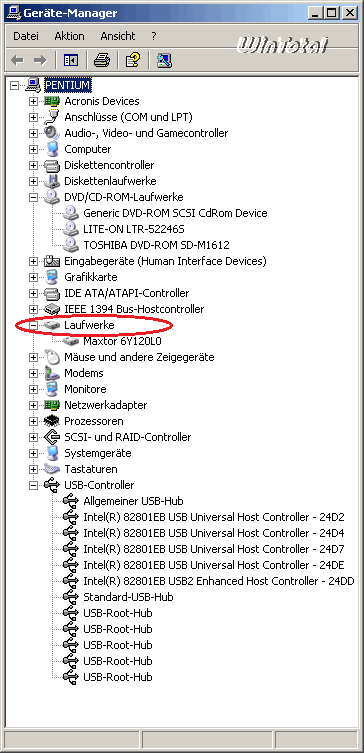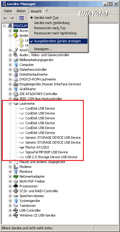 Der Gerätemanager von Windows zeigt im Normalbetrieb leider nur die angeschlossenen bzw. vorhandenen Geräte an