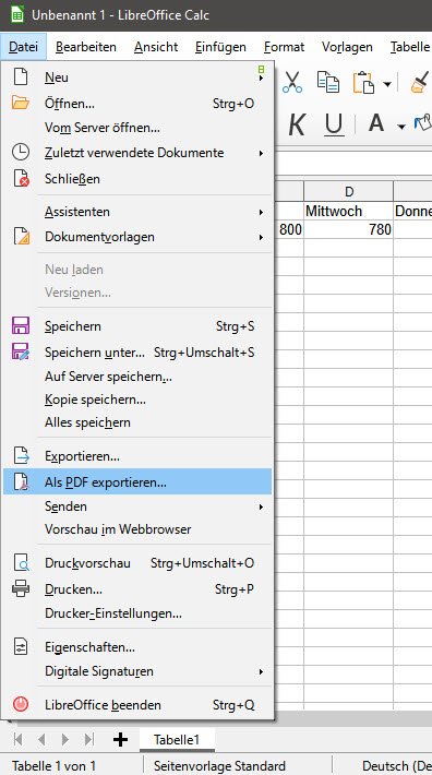 Wie auch andere Office-Programme, kann Calc eine Tabelle auch in ein PDF umwandeln, so dass die Tabelle mit jedem Betriebssystem und Browser anzeigt, der Inhalt aber nicht verändert werden kann. Sie finden die Funktion „Als PDF exportieren“ direkt im Menü „Datei“.