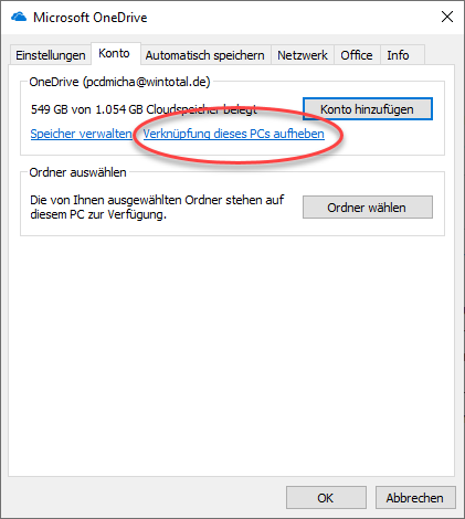 In nächsten Schritt müssen eine eventuelle Verknüpfung mit dem PC aufheben. Klicken Sie dazu auf den entsprechenden Textlink in der Registerkarte „Konto„.