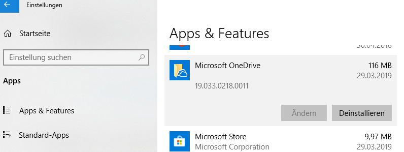 Wenn Sie ganz auf OneDrive verzichten möchten, können Sie den Dienst auch entfernen. Dazu deinstallieren Sie in Windows 10 über die Einstellungen unter Apps -> Apps & Features Microsoft OneDrive.
