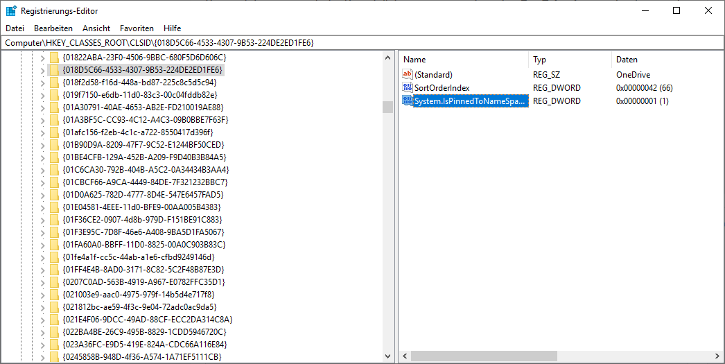 und ändern Sie hier den Wert für den Eintrag System.IsPinnedToNameSpaceTree von „1“ auf „0“ . Damit wird Windows angewiesen, das Icon zu entfernen.