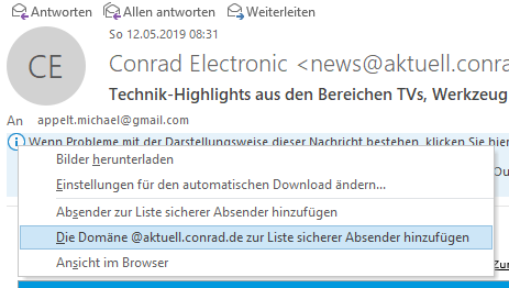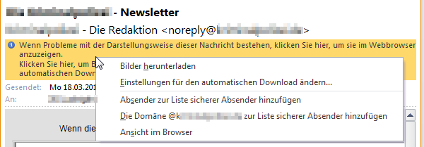 Wenn Sie häufig Mails von Absendern erhalten, denen Sie vertrauen und deren Bilder Sie immer direkt sehen möchten, können Sie über einen Rechtsklick in der Infoleiste den Absender oder die ganze Domäne zu einer Liste sicherer Absender hinzufügen. Alle Absender auf der Liste werden von der Restriktion ausgenommen, deren Bilder werden also direkt angezeigt.
