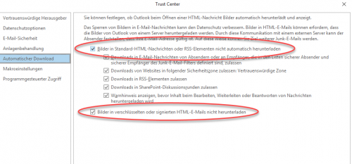 Dort können Sie die Restriktion „Bilder in Standard-HTML-Nachrichten oder RSS-Elementen nicht automatisch herunterladen“ deaktivieren. Ergänzend dazu ist die Restriktion „Bilder in verschlüsselten oder signierten HTML-E-Mails nicht herunterladen“ ebenfalls zu deaktivieren.