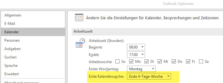 Die richtige Vorgabe für die 4-Tages-Woche stellen Sie in Outlook unter Datei-> Optionen -> Kalender ein. Ändern Sie hier die Vorgabe für die erste Kalenderwoche auf „Erste 4-Tage-Woche“.